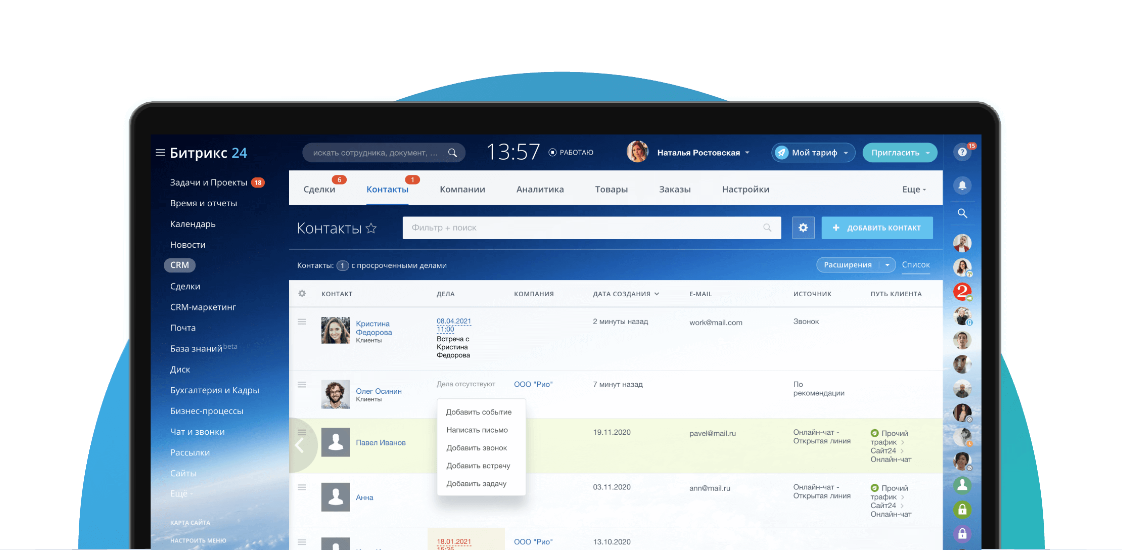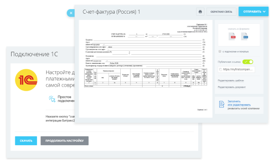 Битрикс24 и 1С могут обмениваться данными о товарах, контактах, компаниях и заказах в реальном времени. При этом работать с документами можно прямо в карточке CRM!